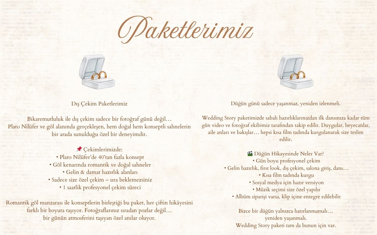 Her çiftin hikâyesi farklı, bu yüzden paketlerimizi sayfadan satın almak yerine sizinle birebir planlıyoruz.